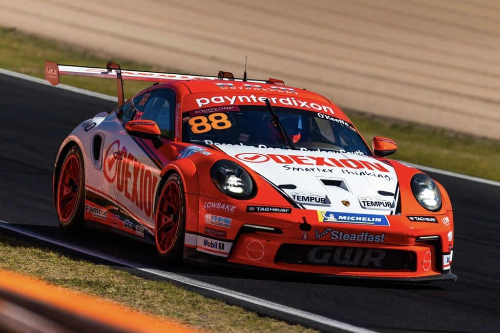 When the track dried for Friday’s opening race, O’Keeffe was immediately more comfortable with the performance of his Dexion Porsche and he charged forward with some incisive passes, including a spectacular move around the outside through the Chase, ultimately making his way up to second.